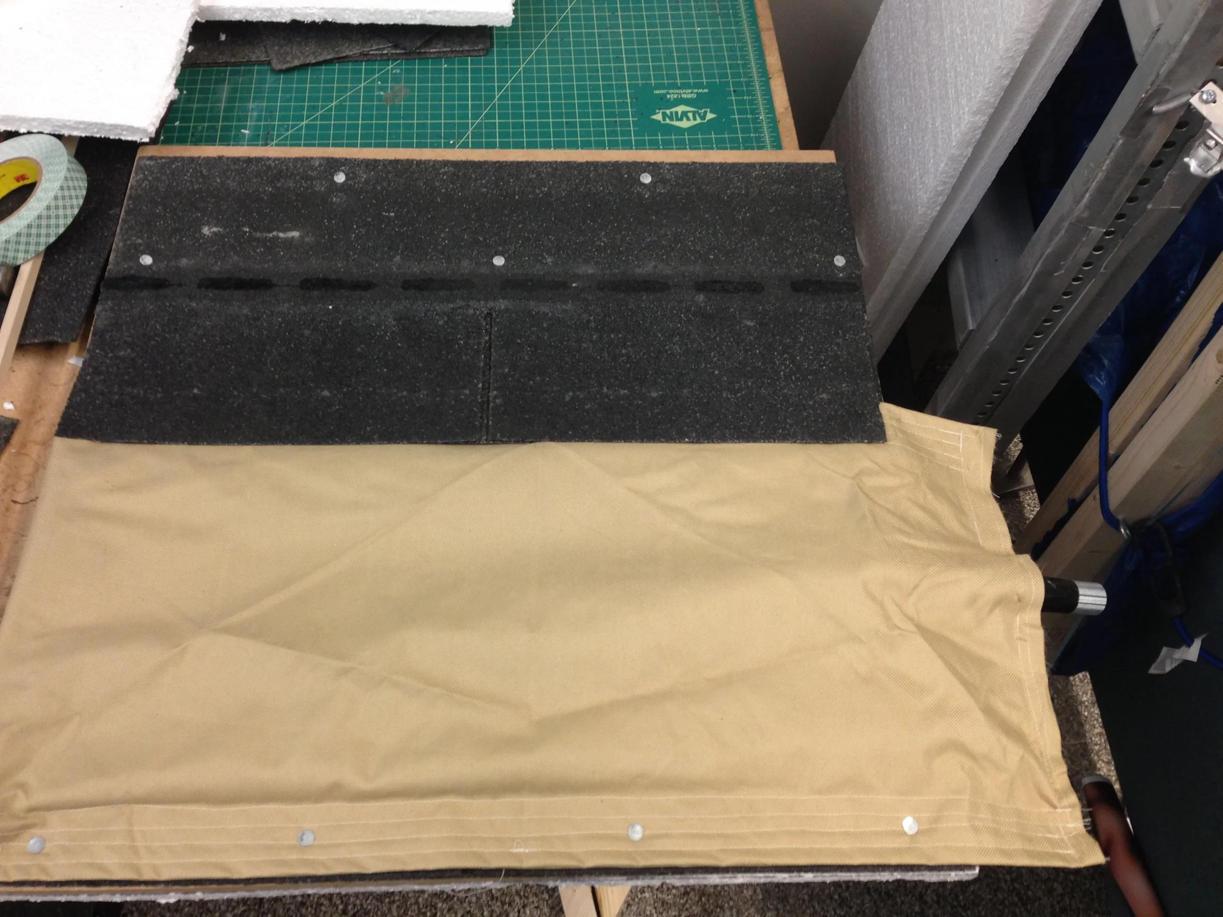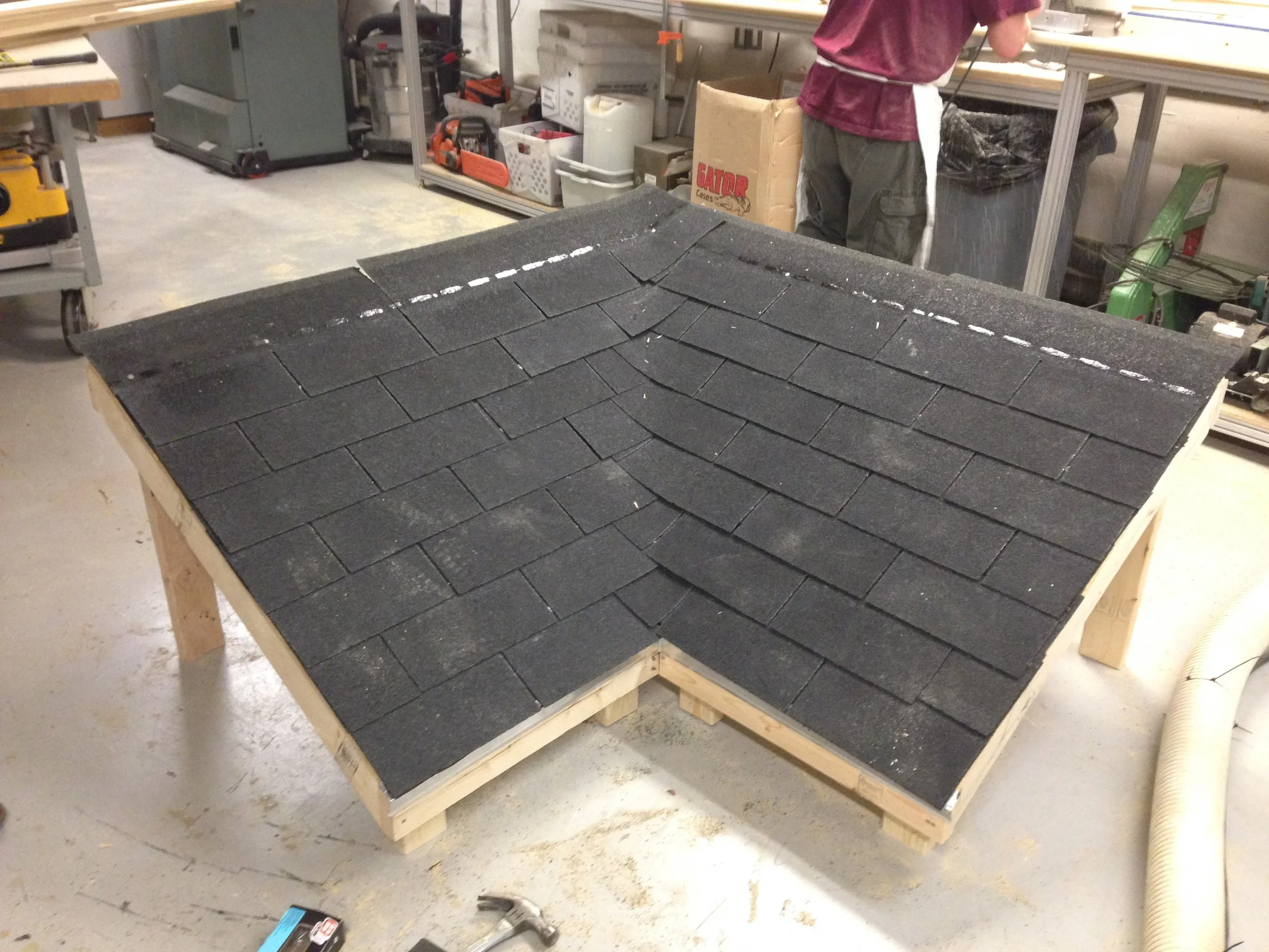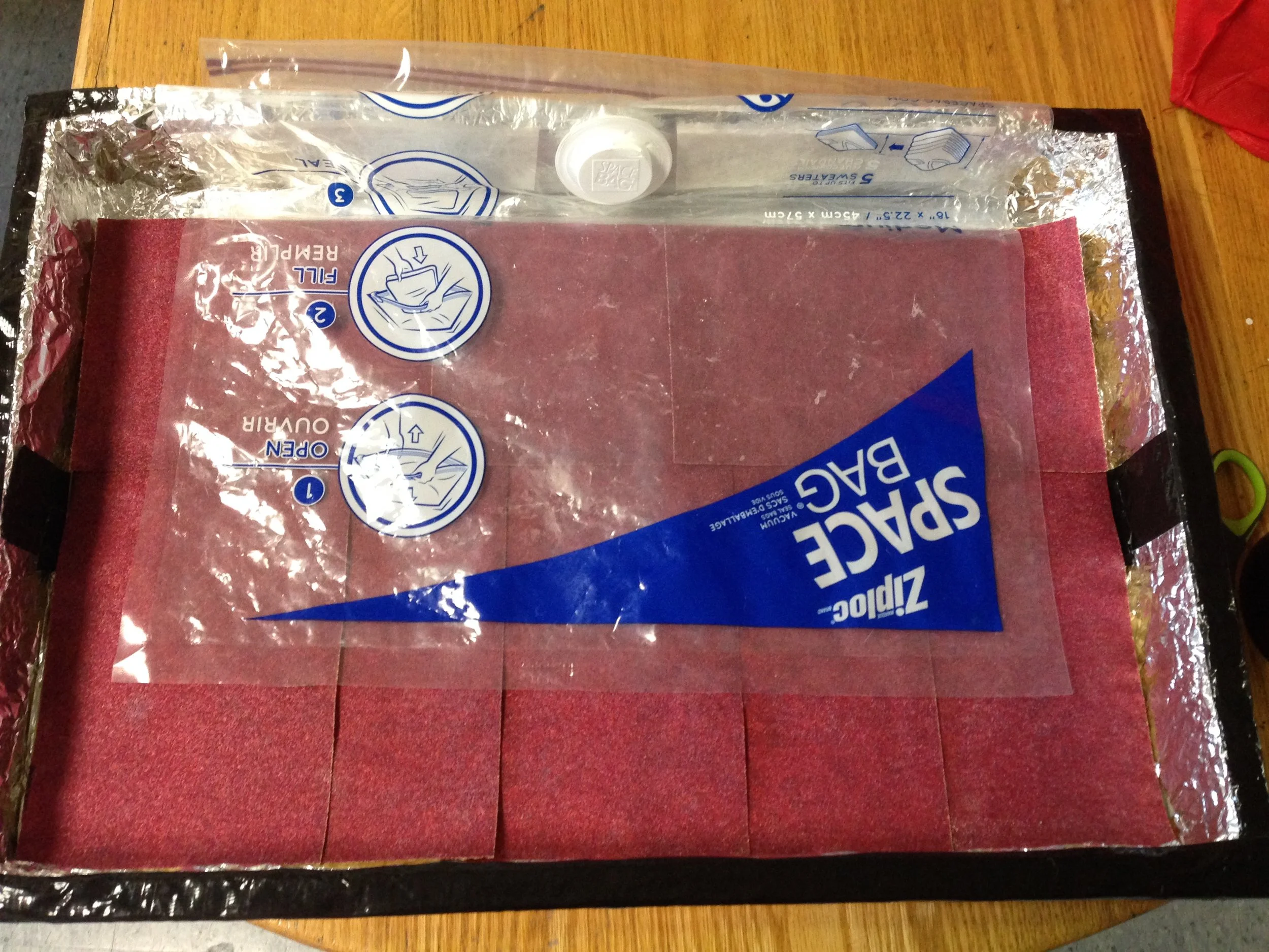 An outdoor furniture cover was repurposed to create an outer shell. By changing the color of the fabric, the bladder could be easily configured to blend into the shingles of the house. Plastic sheeting was sealed together to form the inner shell and fitted into the outer shell. The bladder was then nailed down to the edge of a roof setup and tested.