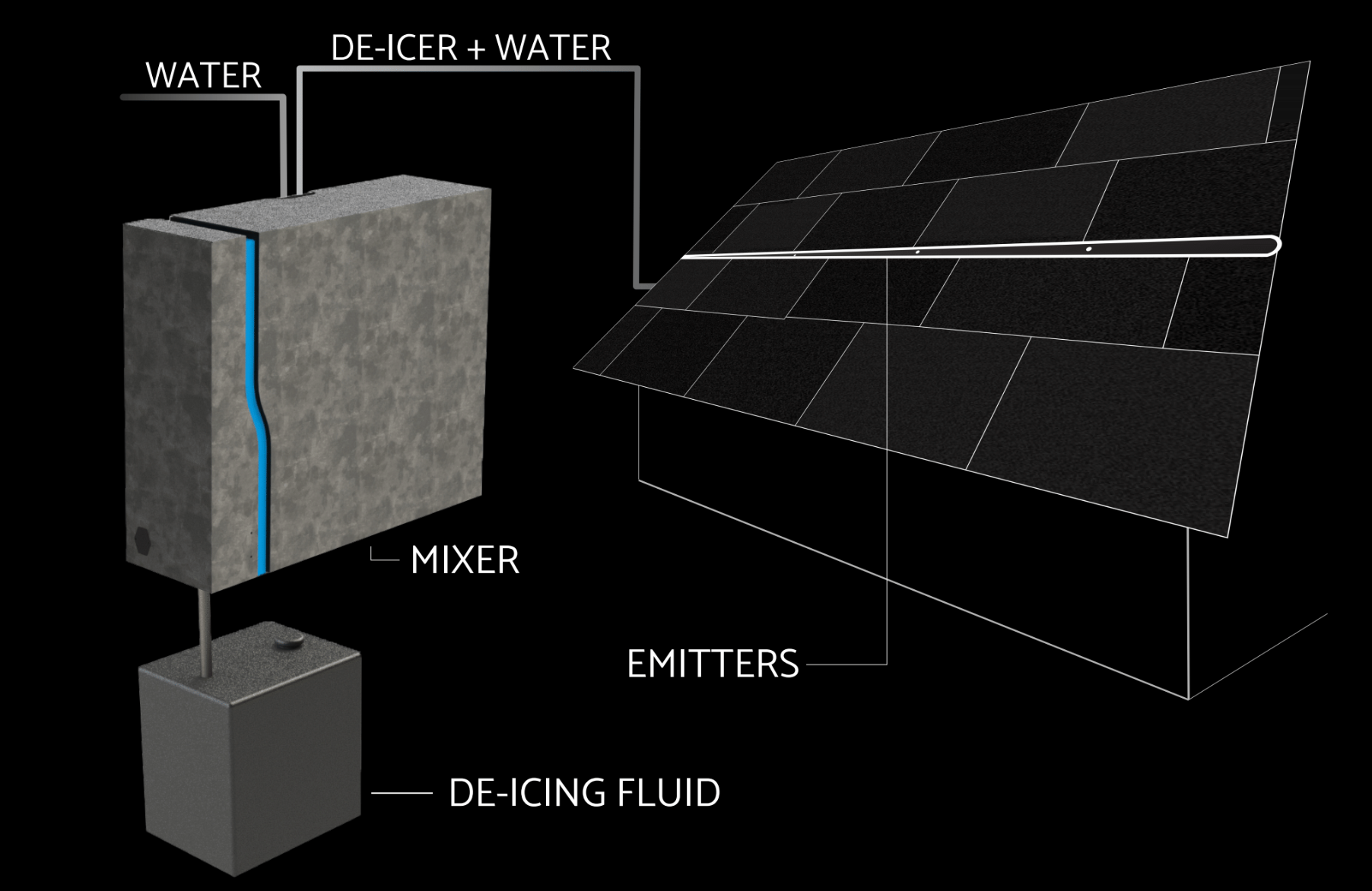 floe is a roof deicing system which prevents damage caused by ice dams in the wintertime. If the system senses ice dam conditions (adequate moisture in the air and temperatures below freezing), it begins the deicing process. Water and deicing fluid are first mixed together and then sent to emitters on the roof. The emitters then drip the fluid onto the roof to cut through any ice buildup and protect the house from related damage.