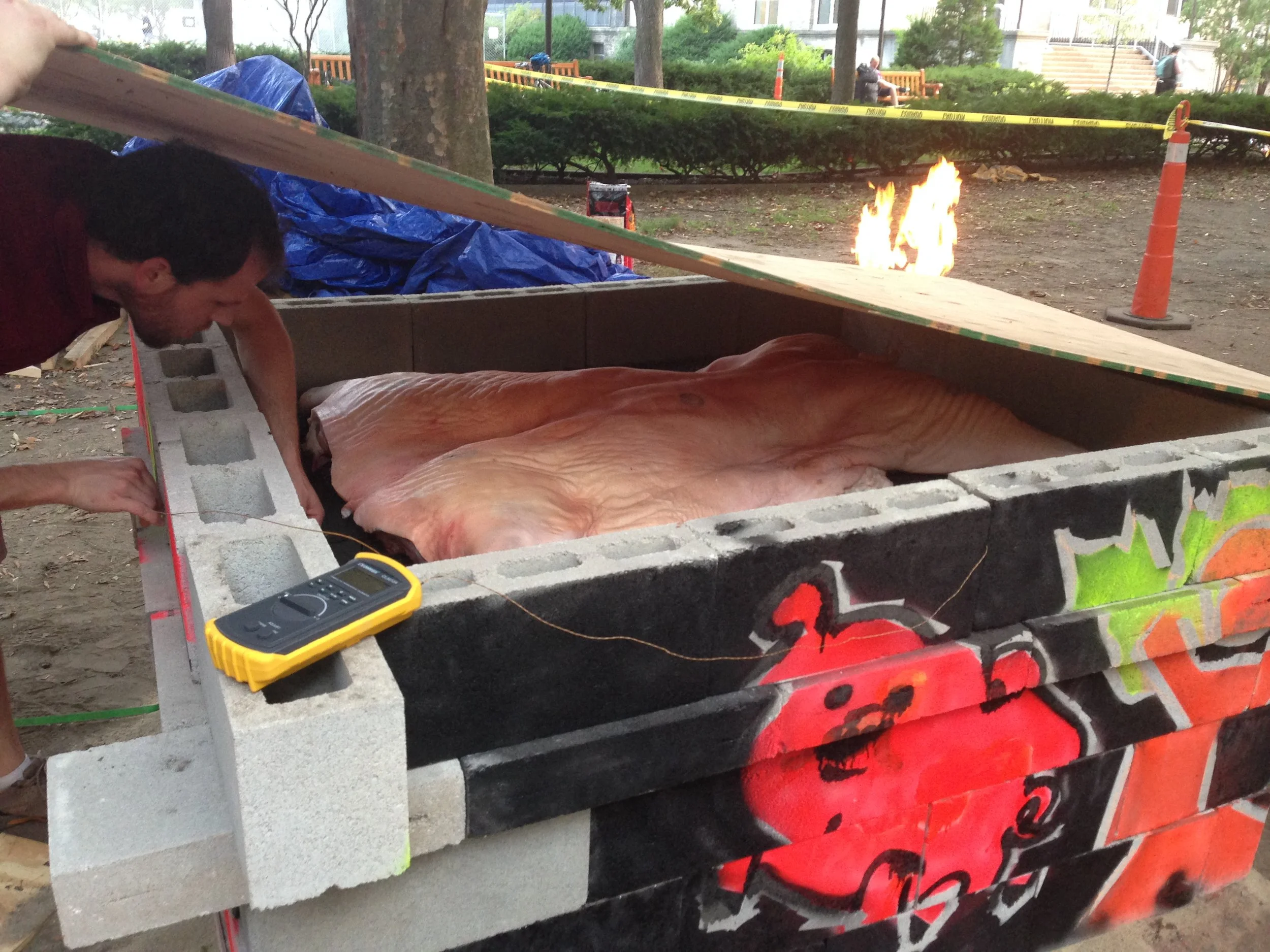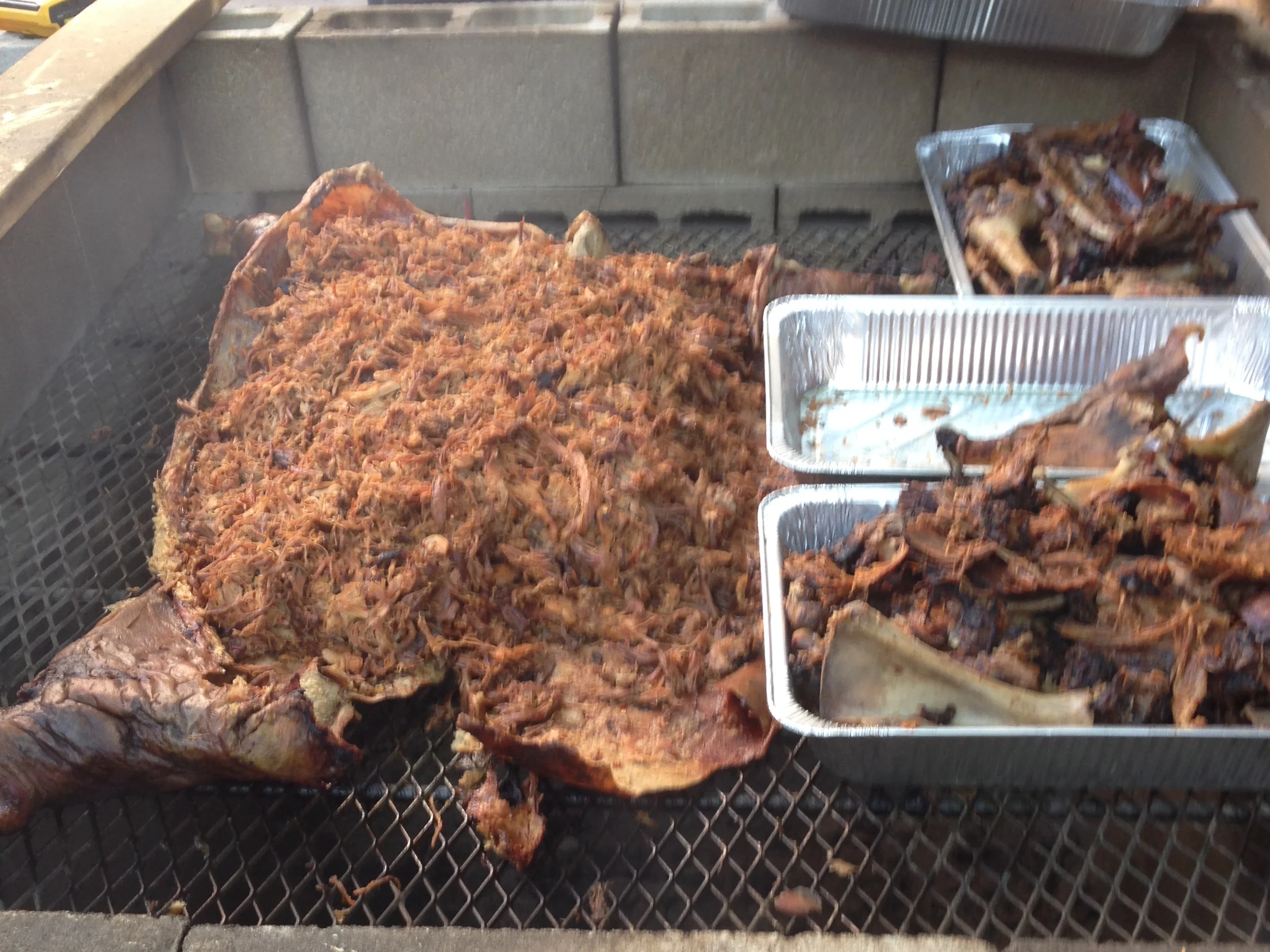 This cooker has an all cinderblock construction with the exception of the rebar and the expanded steel grate that are used to suspend the pig. Underneath the grate is the disposable sand used to absorb the pig's drippings and the cooker's heat source, charcoal.